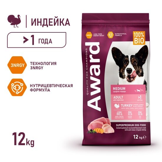 Корм сухой Award для взрослых собак средних пород с индейкой и курицей с добавлением моркови и черной смородины 12кг информация:
