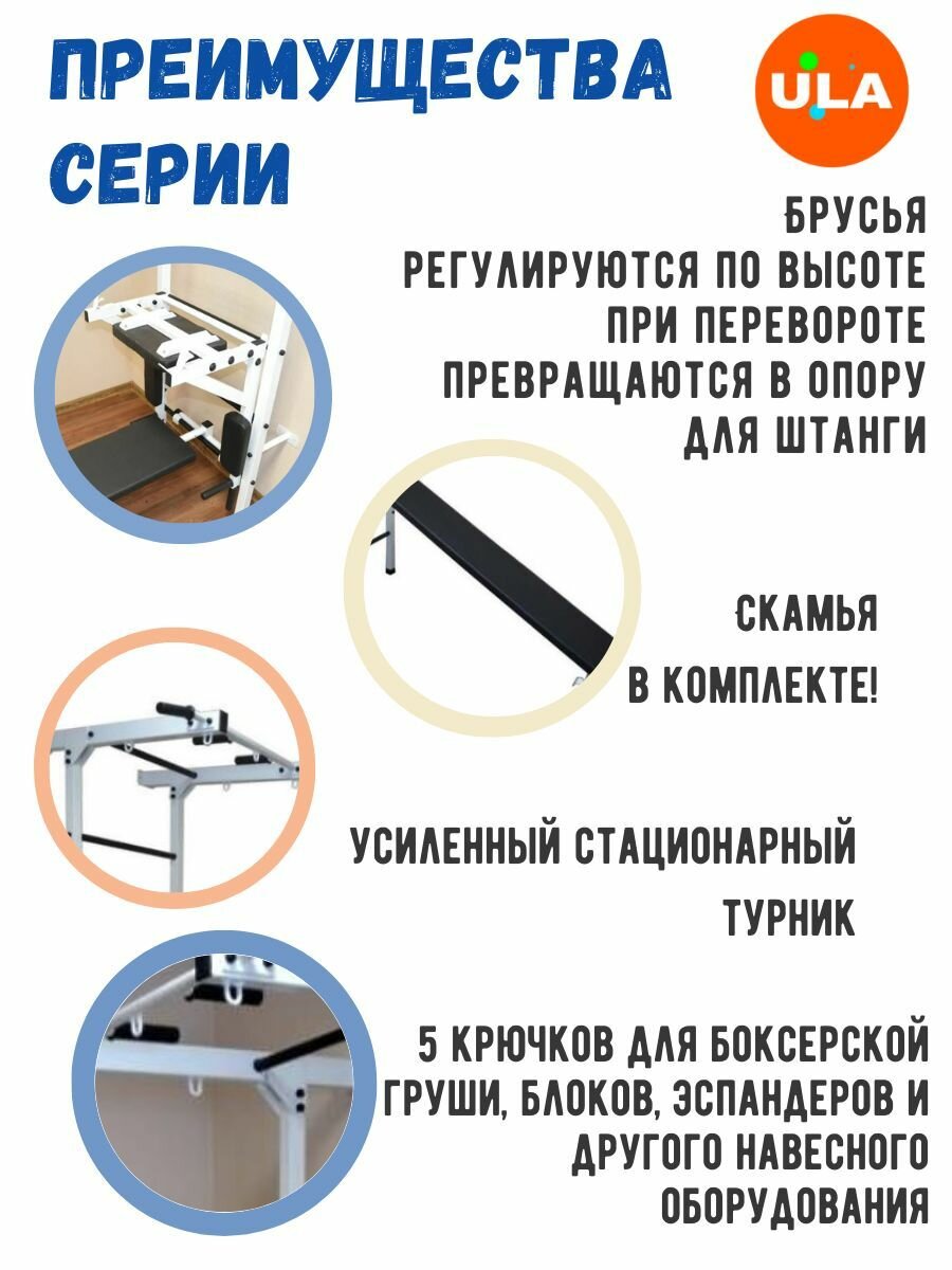 | Дополнительная информация | брусья-пресс при перевороте превращаются в опору для штанги |