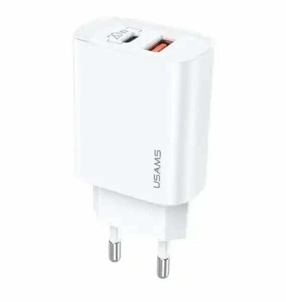 Сетевое зарядное устройство Usams CC121 с функцией одновременной быстрой зарядкой двух устройств Fast Charger QC 3.0 + PD 3.0, 20W, адаптер для iPhone 12 с Type C и USB12 портами. Цвет-белый