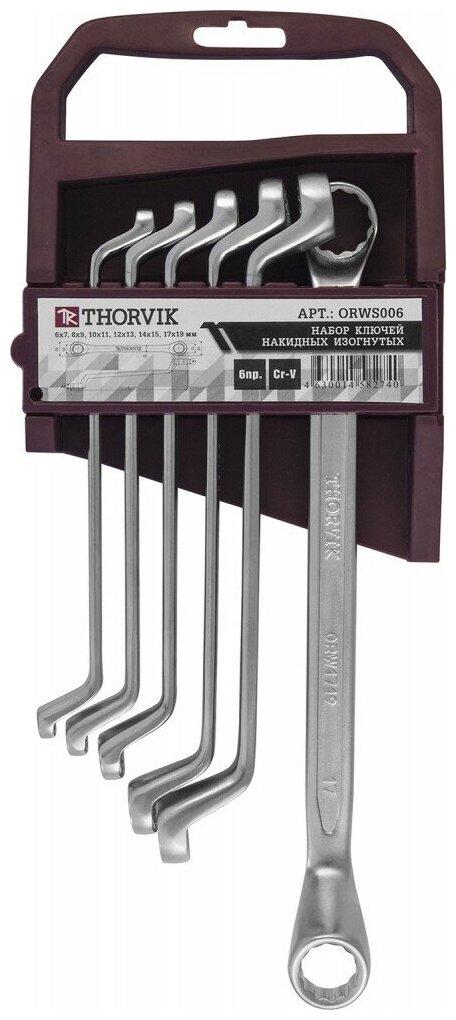 Набор ключей гаечных накидных изогнутых 75° на держателе, 6-19 мм, 6 предметов, thorvik, orws006