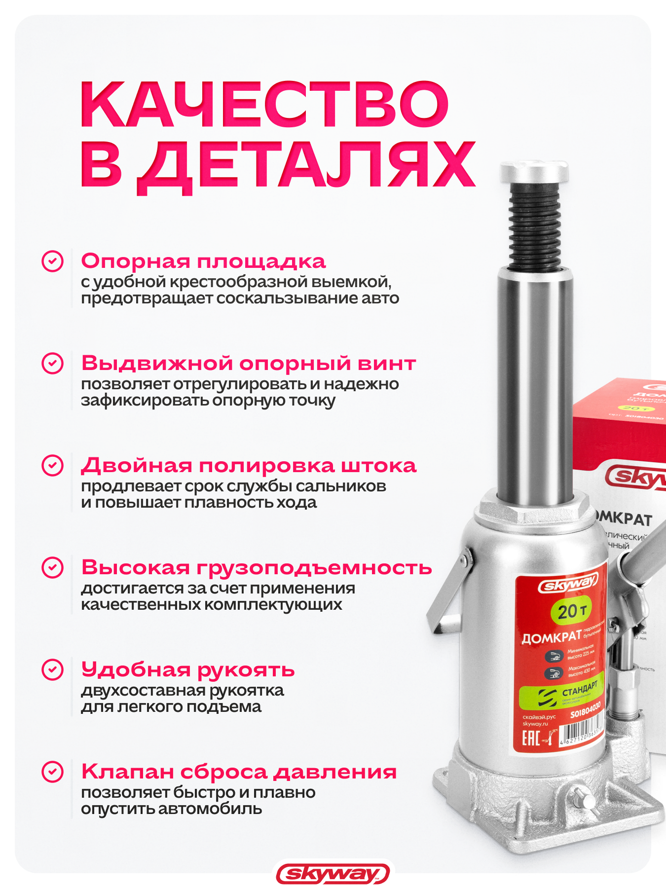 Домкрат SKYWAY, гидравлический, бутылочный, 20 тонн, серый, h 225-430мм, S01804030 информация: