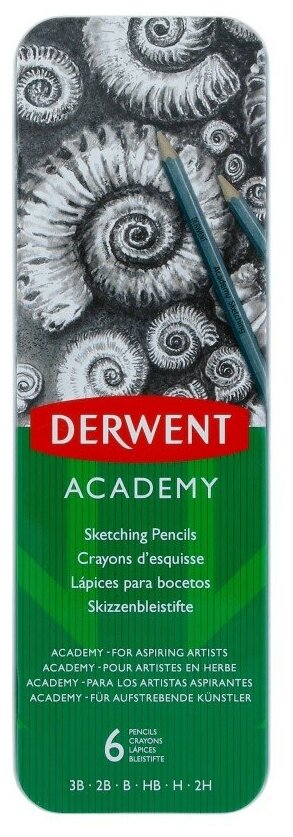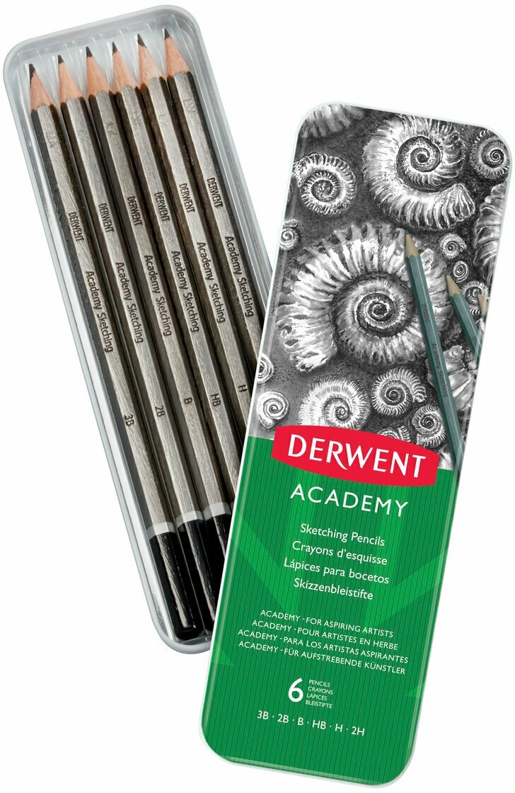 10 цен на Набор карандашей Derwent Academy Sketching Tin 6 шт 3B-2H, шестигранные в металлической коробке, художественные