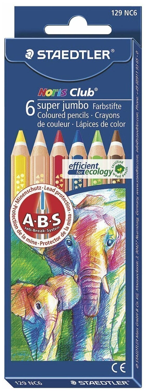 Карандаши цветные утолщенные STAEDTLER (Германия) "Noris Club", 6 цветов, грифель 6 мм, европодвес, 129 NC6 - 1 шт.