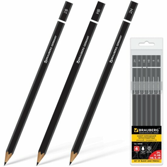 Карандаши чернографитные разной твердости набор 6 штук, 2H-2B, BRAUBERG "Line", 180650, 180650 681 ₽