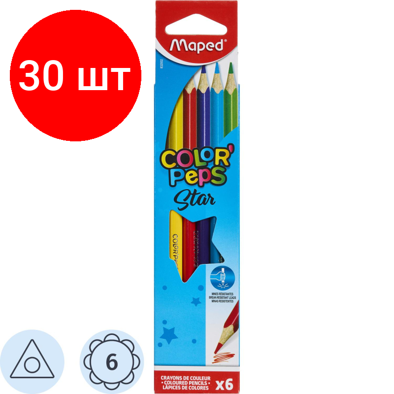 10 цен на Комплект 30 наб, Карандаши цветные Maped COLOR"PEPS STAR, трехгранные, дерево,6 цв/наб,832002