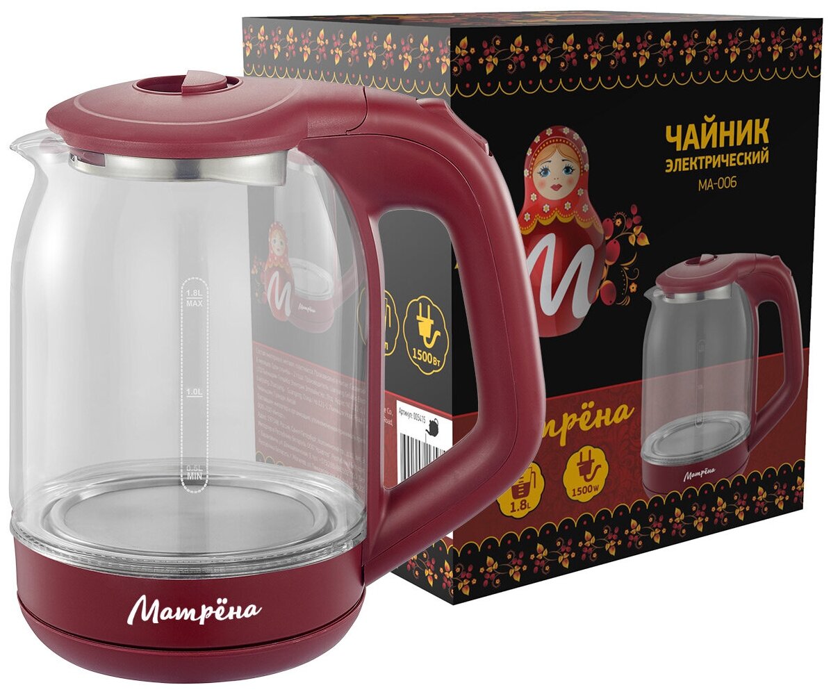 Стеклянный чайник электрический Матрена MA-006, 1,8 л, пластик вишневый 1 522 ₽