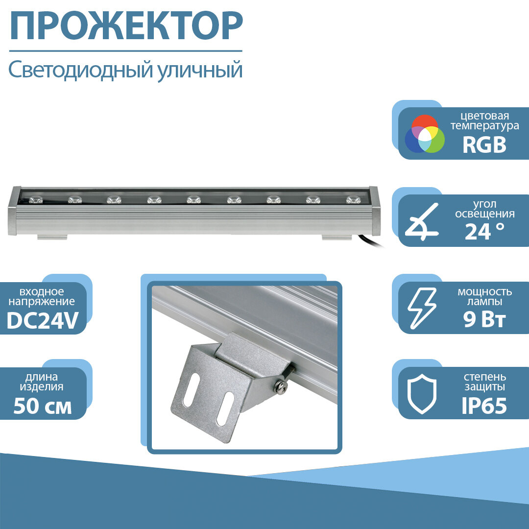 Прожектор светодиодный цветной уличный светильник линейный Uniel ULF-L52, 9W, RGB, 50 см, IP65, DC24V информация: