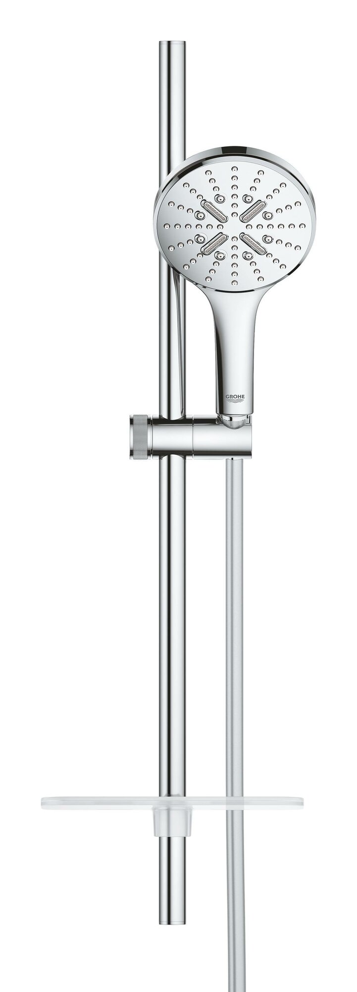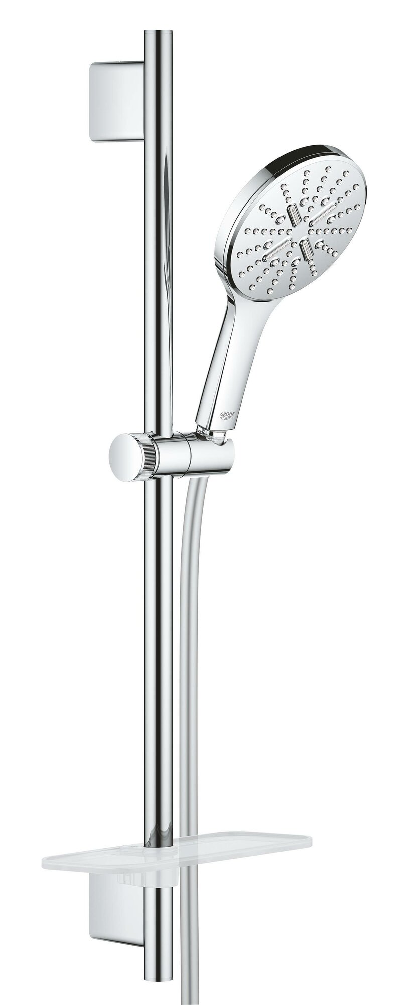 | Комплектация | ручной душ Rainshower SmartActive 130 (26 574) / душевая штанга 600 мм с металлическими настенными креплениями / душевой шланг 1750 мм (28 388 000) / Полочка GROHE EasyReach |