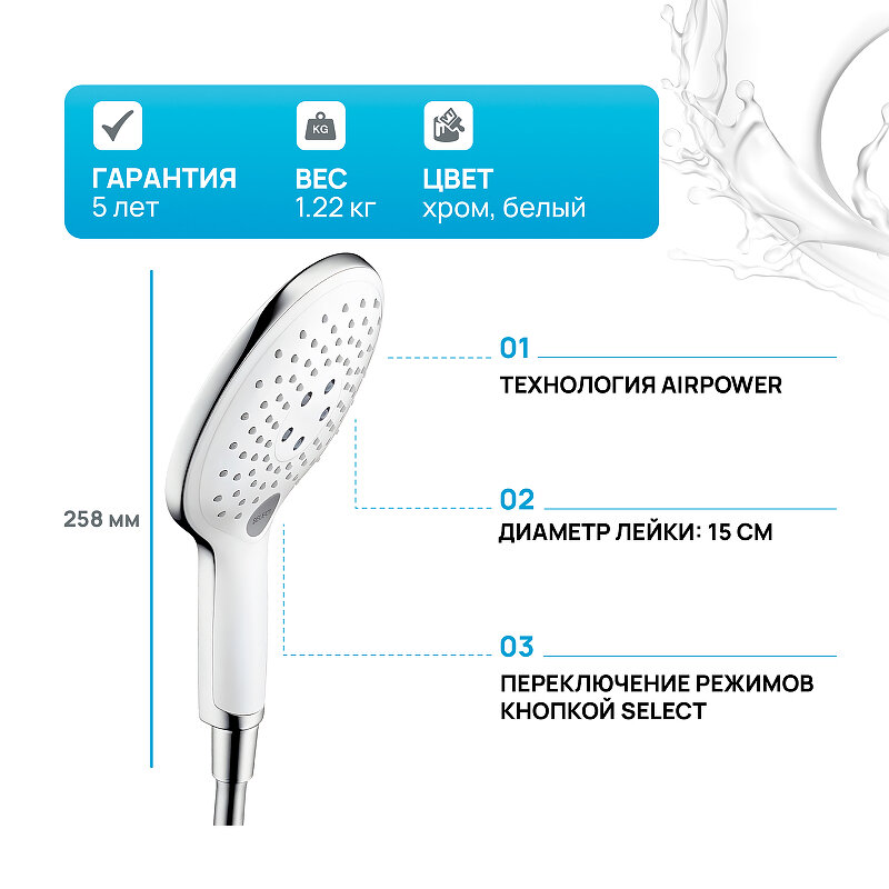 HG Raindance Select S 150 Ручной душ 3jet (RainAir, CaresseAir, Mix), G1/2, цвет: белый/хром 27 598 ₽