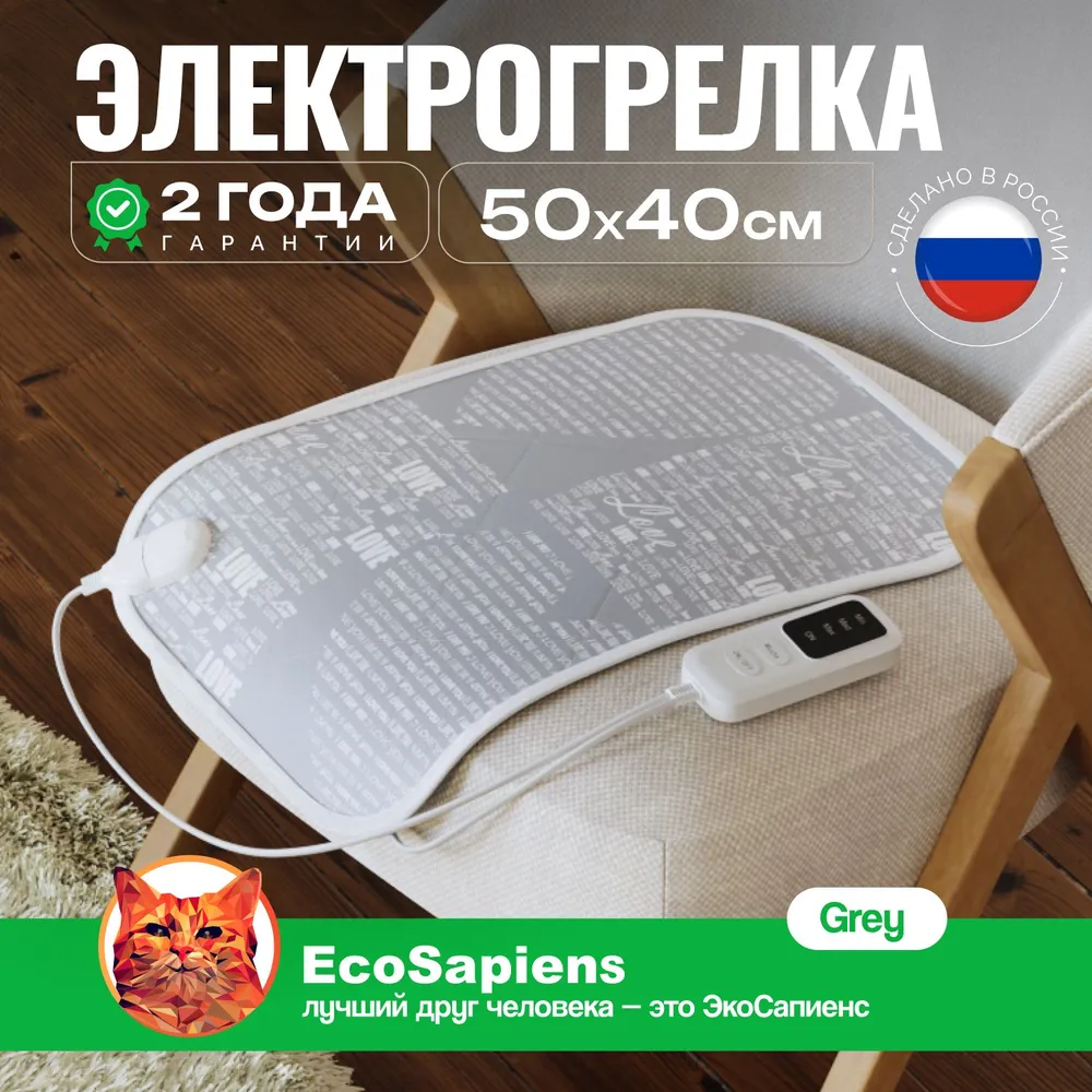 Электрогрелка EcoSapiens Grey, грелка электрическая c 3 программами нагрева, инфракрасное тепло,35 Ватт, 40х50см