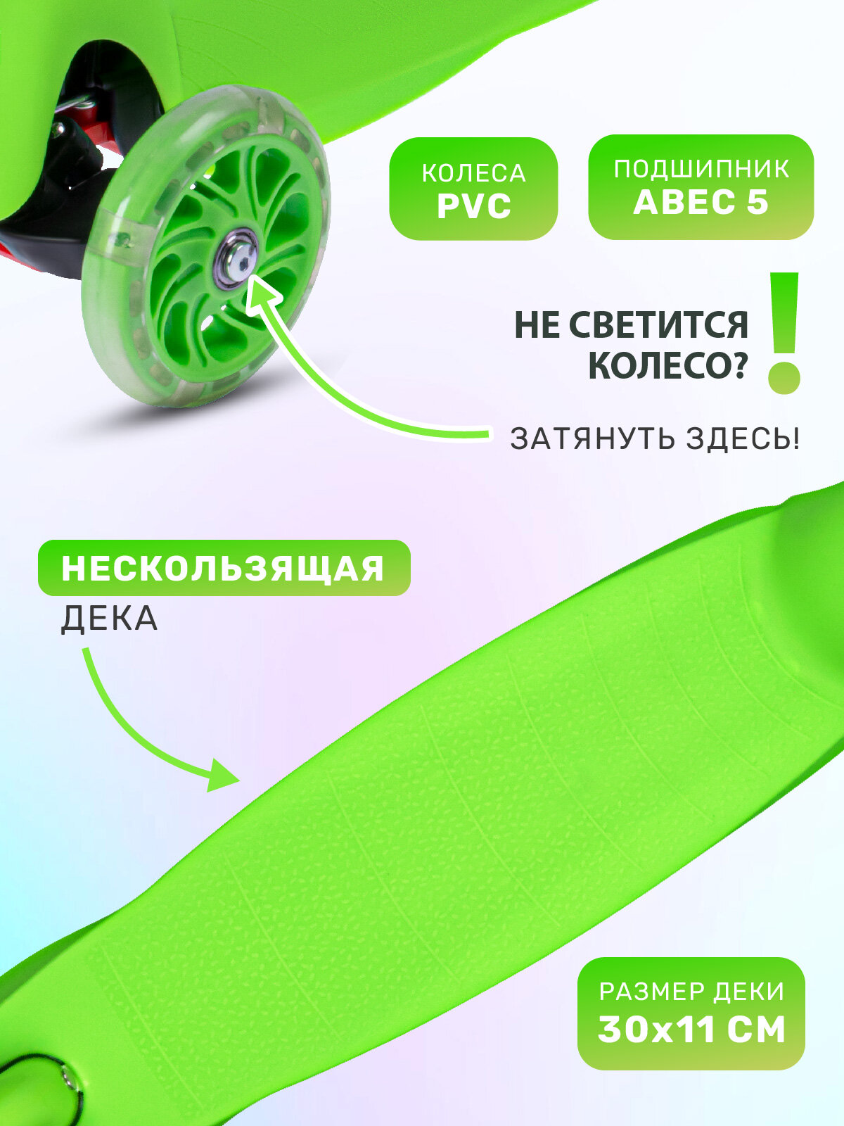 Самокат трехколесный детский TOPEMOUNT "Gold Scooter" , музыкальный, светящаяся дека, фара, Зеленый
