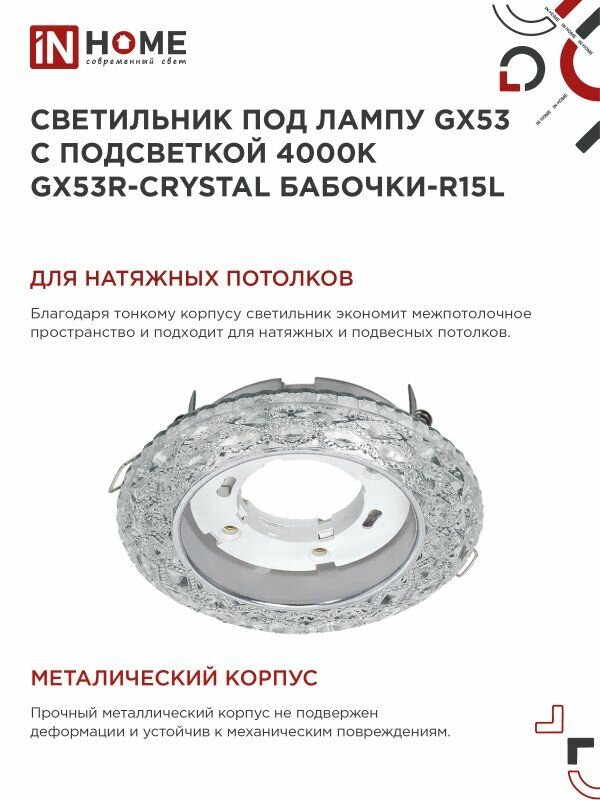 Светильник встраиваемый GX53R-crystal БАБОЧКИ-R15L с подсветкой 4К под GX53 Прозрачный/Хром IN HOME информация: