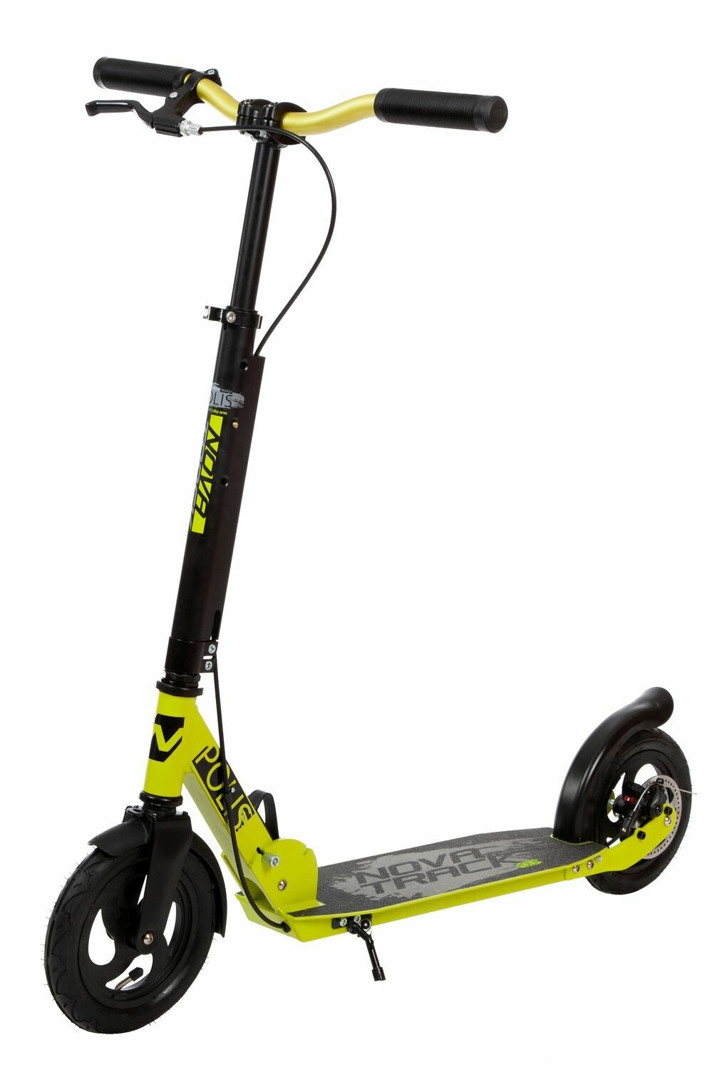 Самокат городской NOVATRACK POLIS с ручным дисковым тормозом, алюм., складной, эргономичный Y-руль с нескладными рукоятями, ватер стикер, колеса надувные 200*200мм с алюминиевым ободом, зеленый