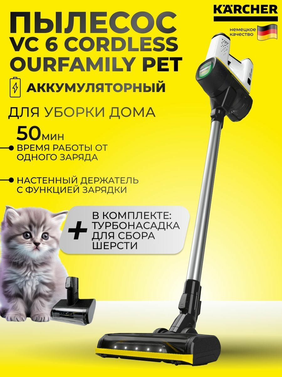 Пылесос для дома Karcher VC 6 Cordless ourFamily Pet, для дома, для животных, 180 аВт, 5 лет гарантия 50 043 ₽