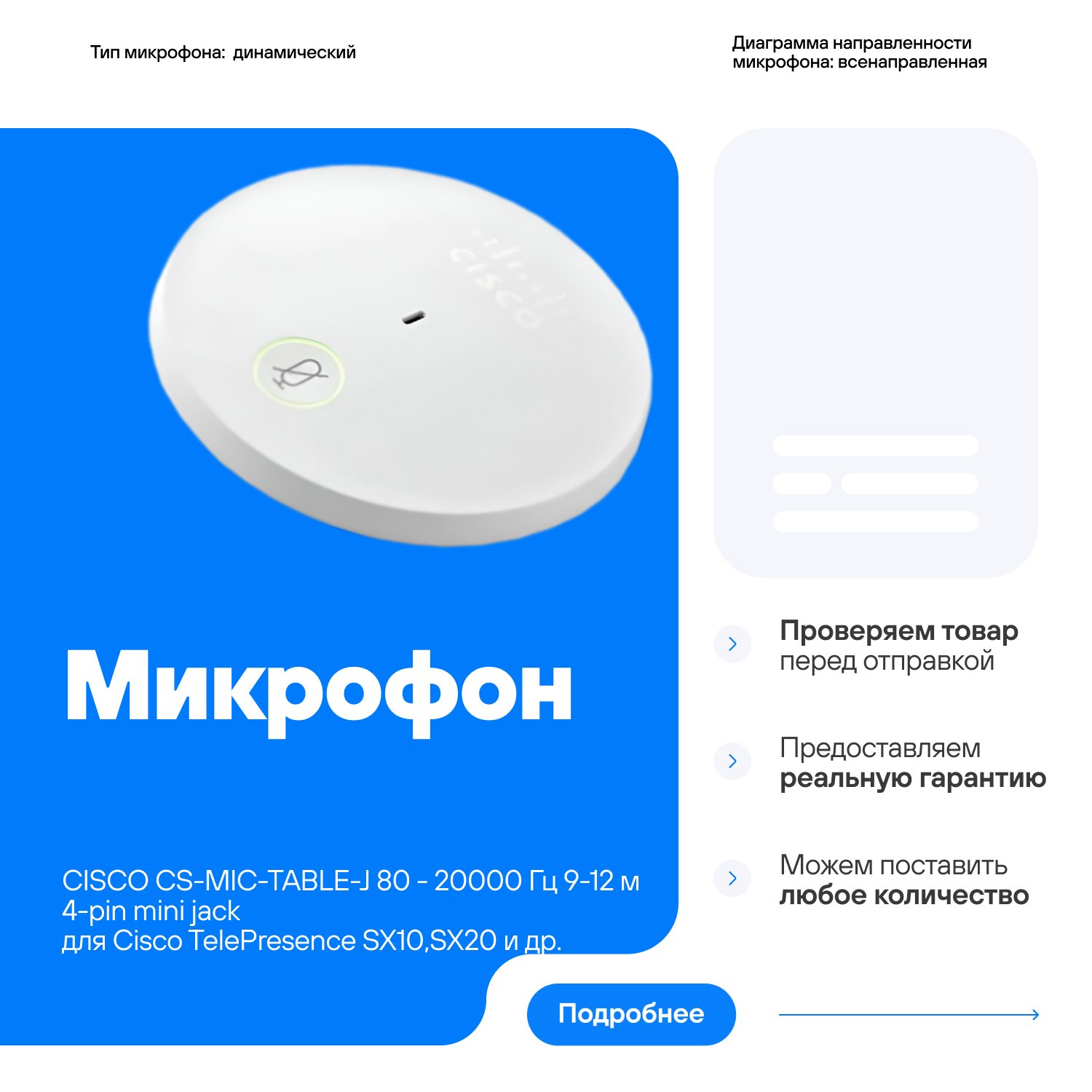 Отзывы на Микрофон CISCO CS-MIC-TABLE-J 80 - 20000 Гц 9-12 м 4-pin mini jack 3,5мм для Cisco TelePresence SX10, SX20