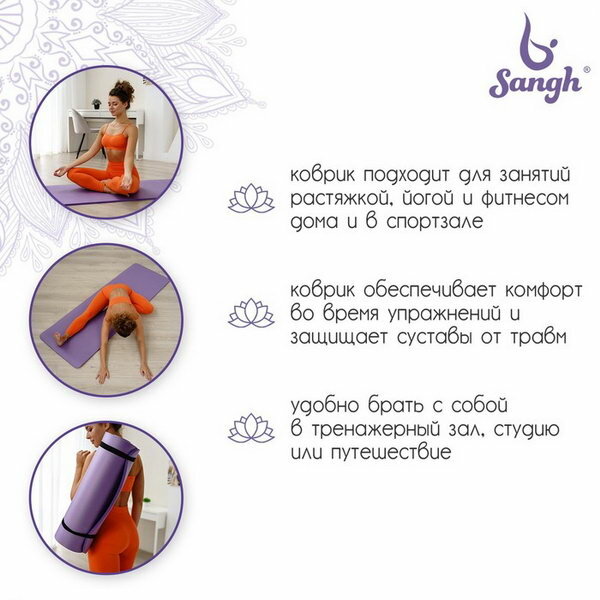 Коврик для йоги Sangh, нескользящий, 183×61×1.5 см, цвет фиолетовый