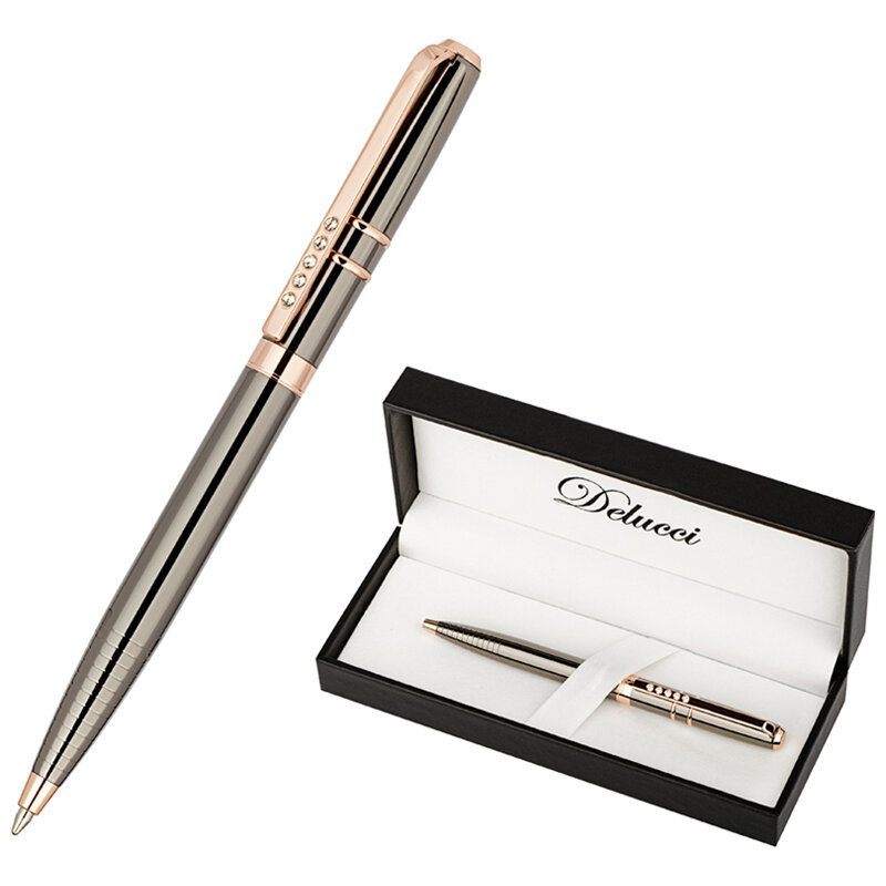 10 цен на Комплект 2 шт, Ручка шариковая Delucci "Sole" синяя 1.0мм, цвет корпуса - оружейный металл, поворот, подарочная упаковка