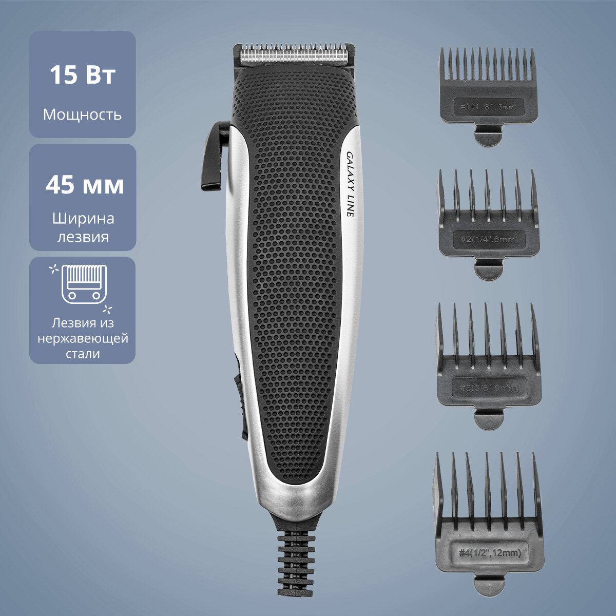 Набор для стрижки Galaxy LINE GL-4107, 15Вт, 4 насадки-расчески, лезвия нержавеющая сталь 45мм