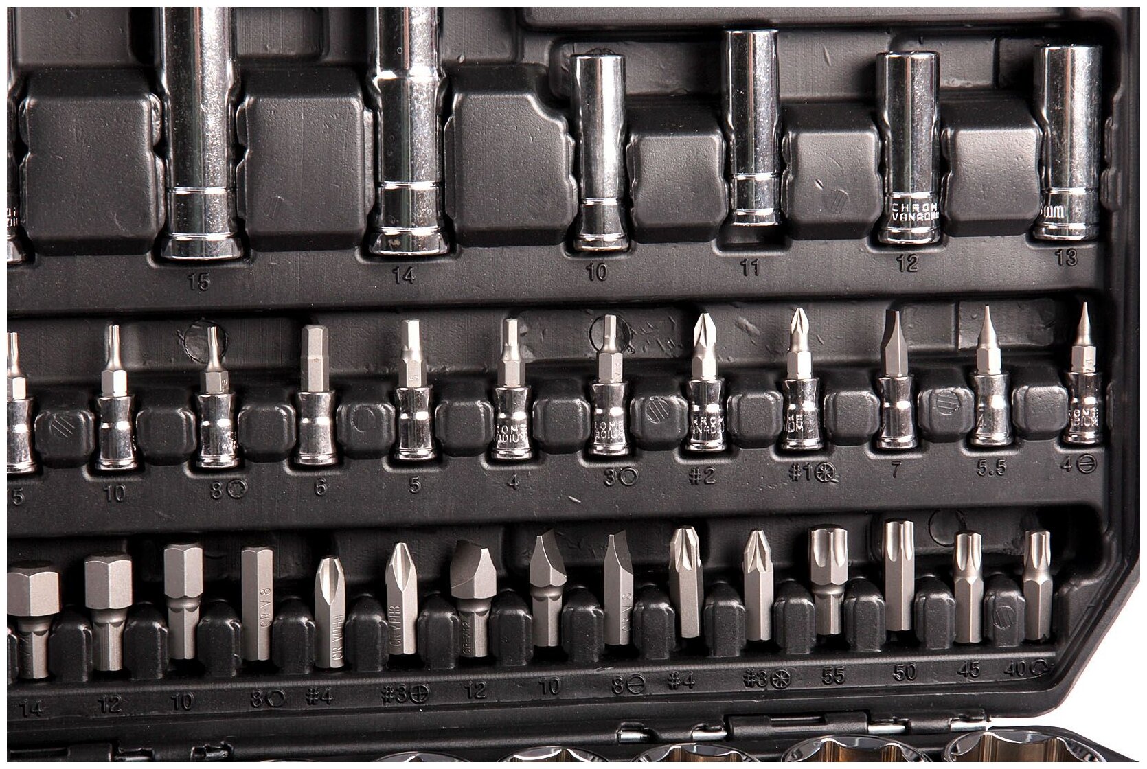 | Головки торцевые подробно | удлинённые 1/2: 14, 15, 17, 19 мм; удлинённые 1/4: 6, 7, 8, 9, 10, 11, 12, 13 мм; 1/2: 10, 11, 12, 13, 14, 15, 16, 17, 18, 19, 20, 21, 22, 23, 24, 27, 30, 32; 1/4: 4, 4.5, 5, 5.5, 6, 7, 8, 9, 10, 11, 12, 13, 14; свечная 1/2: 16, 21; с наконечником: SL: 4, 5.5, 7, РН: 1, 2, Т: 8, 10, 15, 20, 25, 30, РZ: 1, 2, НЕХ: 3, 4, 5, 6 |