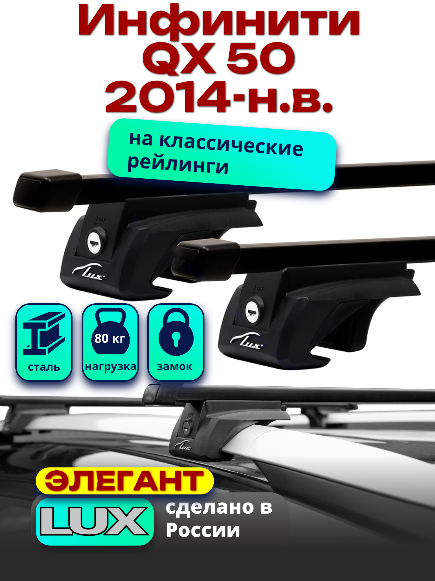 Багажник на крышу Инфинити QX 50 2014-2024 на рейлинги, черный, прямоугольные дуги, LUX элегант информация: