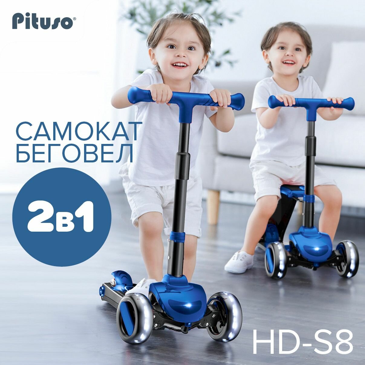 Отзывы на Самокат трехколесный детский Pituso HD-S8, беговел с сиденьем, регулировкой высоты руля, светящиеся колеса, цвет синий