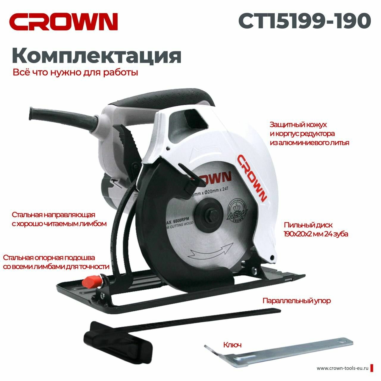 Циркулярная пила дисковая CROWN CT15199-190 (1200Вт, 5500об/мин, диск 190*20*2,0мм, 4,1кг)