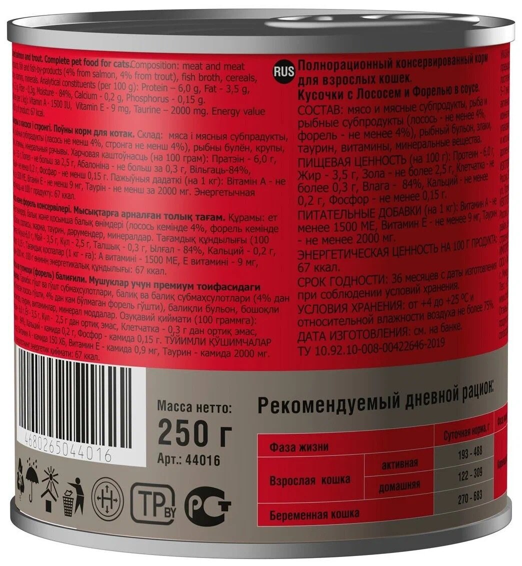 Консервы DARSI для взрослых кошек, Кусочки с Лососем и Форелью в соусе, 250 г, 1 шт информация: