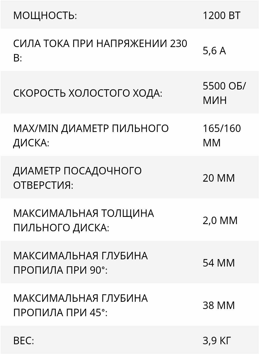 | Глубина пропила (45°) | 38 мм |