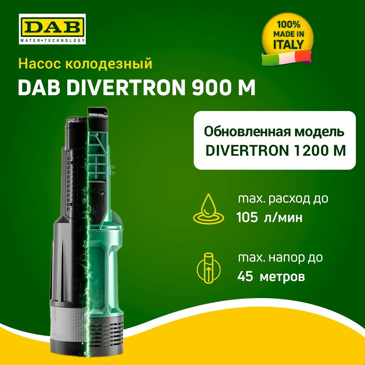 Насос колодезный DAB DIVERTRON 900 M (макс.920 Вт, 105 л/мин, напор 45м) обновленная модель DIVERTRON 1200 M информация:
