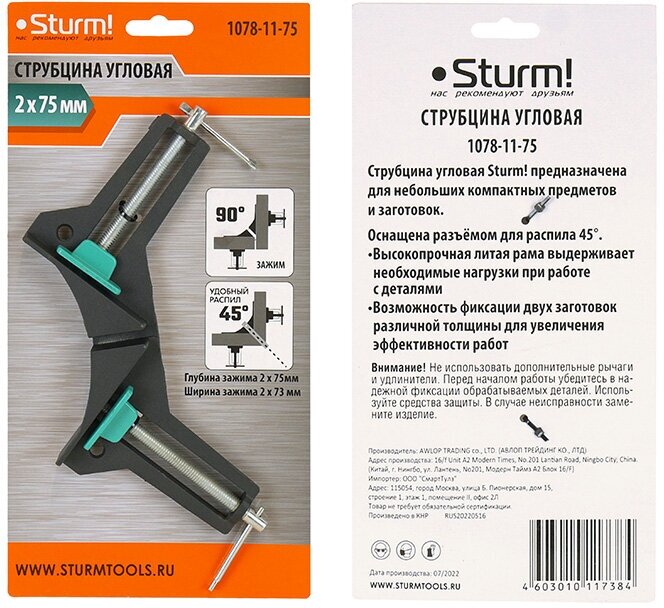 Струбцина STURM 1078-11-75 угловая 2x73мм, глуб. зажима 75мм, угол зажима 90°, разьём пропила 45° (STURM) информация: