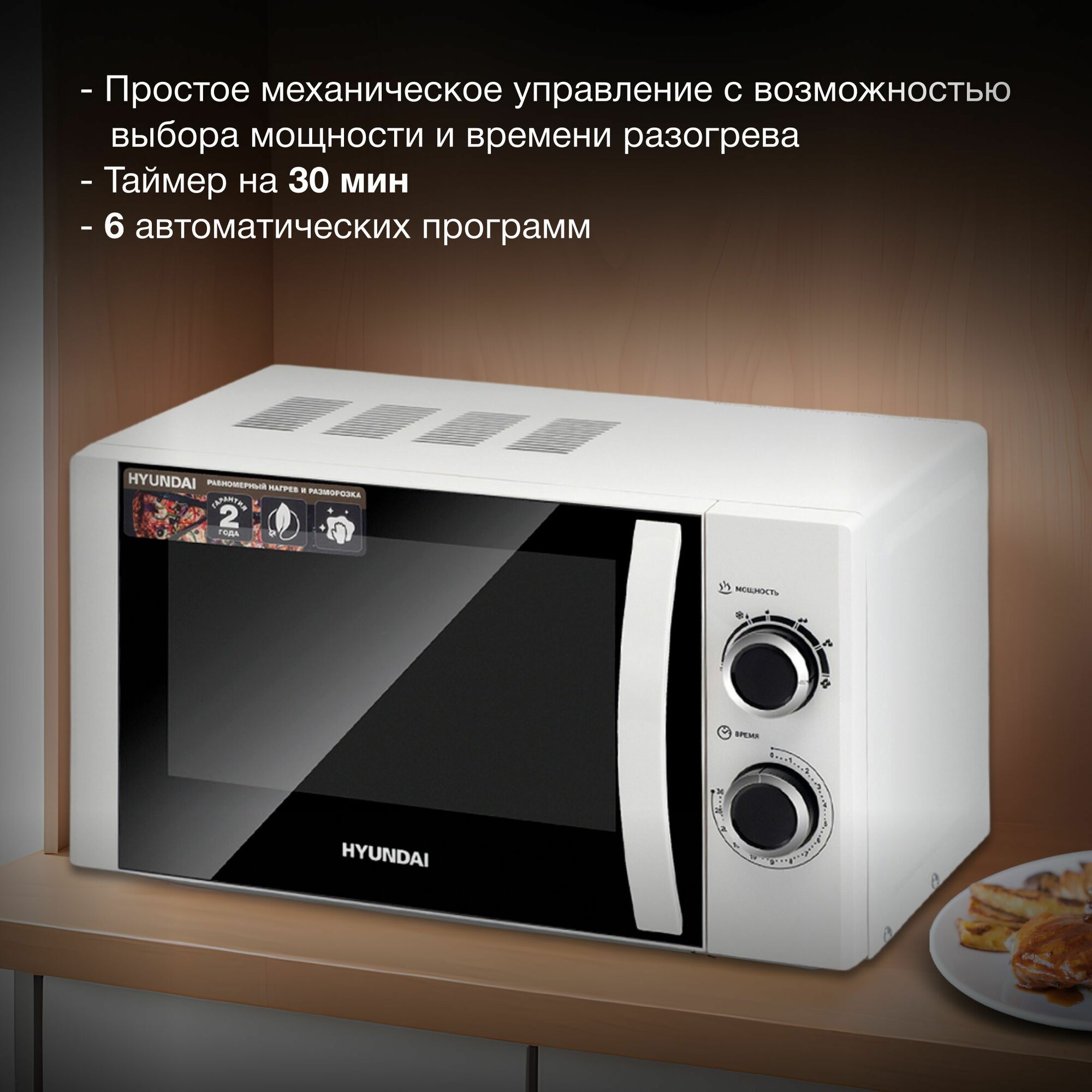 Микроволновая печь Hyundai HYM-M2043 белый, с механическим управлением, поворотным столом 24,5 см, объем камеры 20 л, мощность 700 Вт, открывание дверцы ручкой, функции разогрева и разморозки информация: