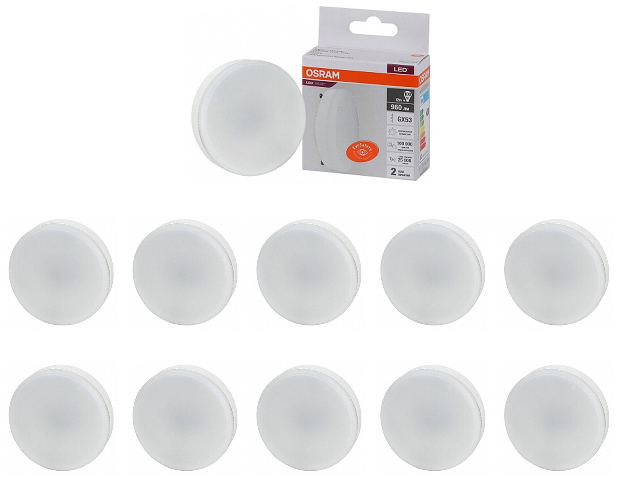 (10 шт.) Светодиодная лампочка OSRAM GX, мощность 12 Вт, напряжение питания 220 В, цветовая температура 4000 К, нейтральный белый свет, цоколь GX53, размер 73х28 мм 3 412 ₽