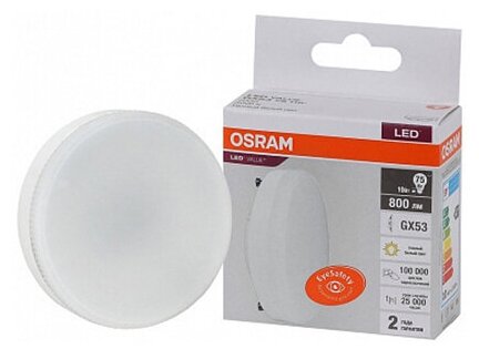 Отзывы на 10шт/уп. Лампа LED Таблетка 10Вт 220-240V GX53 800Лм 3000К Угол 110 град. D-73mm L-28mm Свет Теплый белый OSRAM, уп. 10шт