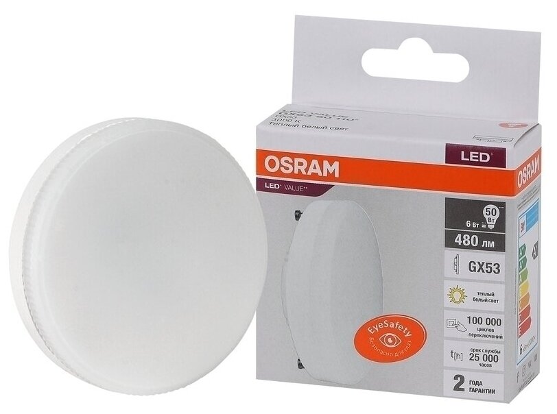 Отзывы на 5шт/уп. Лампа LED Таблетка 6Вт 220-240В GX53 480Лм 3000К Угол 110 град. d 73mm h 25mm Свет Теплый белый Osram, уп. 5шт