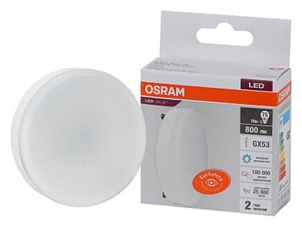 Отзывы на 10шт/уп. Лампа LED Таблетка 10Вт 220-240V GX53 800Лм 6500К Угол 110 град. D-73mm L-28mm Свет Холодный белый OSRAM, уп. 10шт