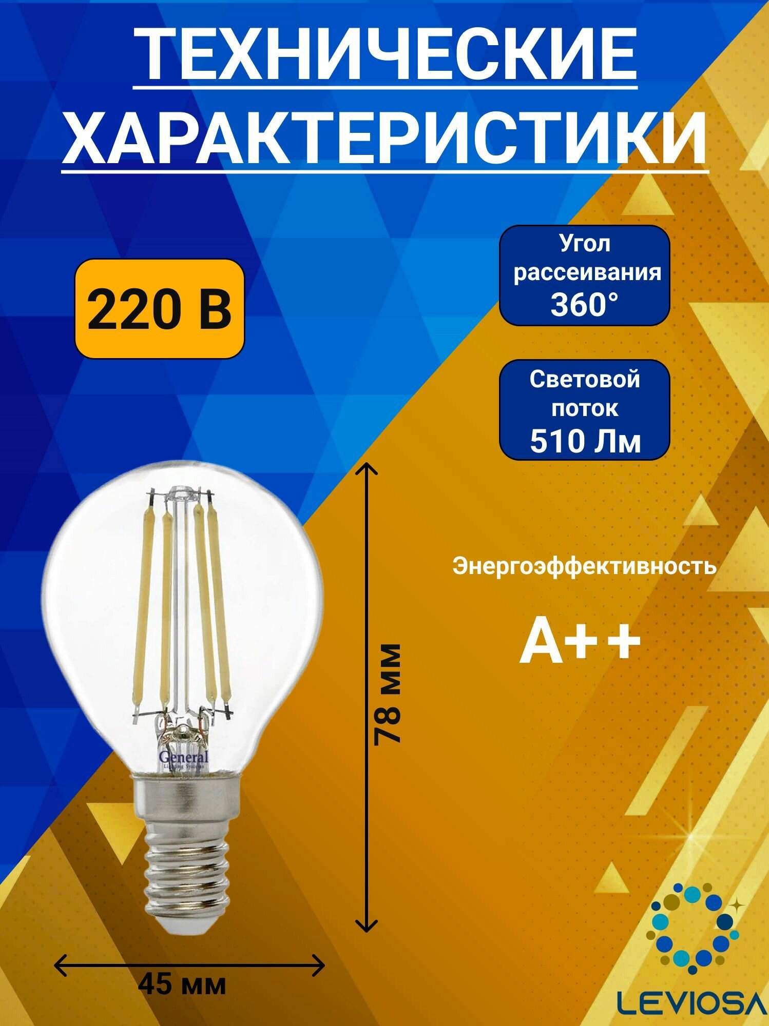 (20 шт.) Светодиодная лампочка General Шар P45 E27 10W 4500K 4K 35x98 филамент (нитевидная), прозр. 649910 Нейтральный белый. Цоколь E27 4 656 ₽