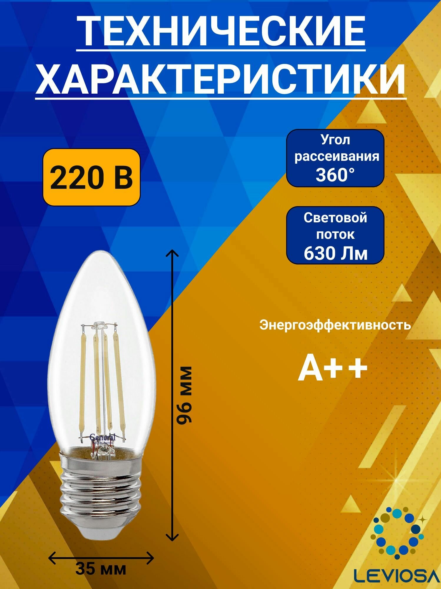 (5 шт.) Светодиодная лампочка General свеча E27 7W 6500K 6K 35x96 филамент (нитевидная), прозр. 649800 Холодный белый. Цоколь E27 1 165 ₽