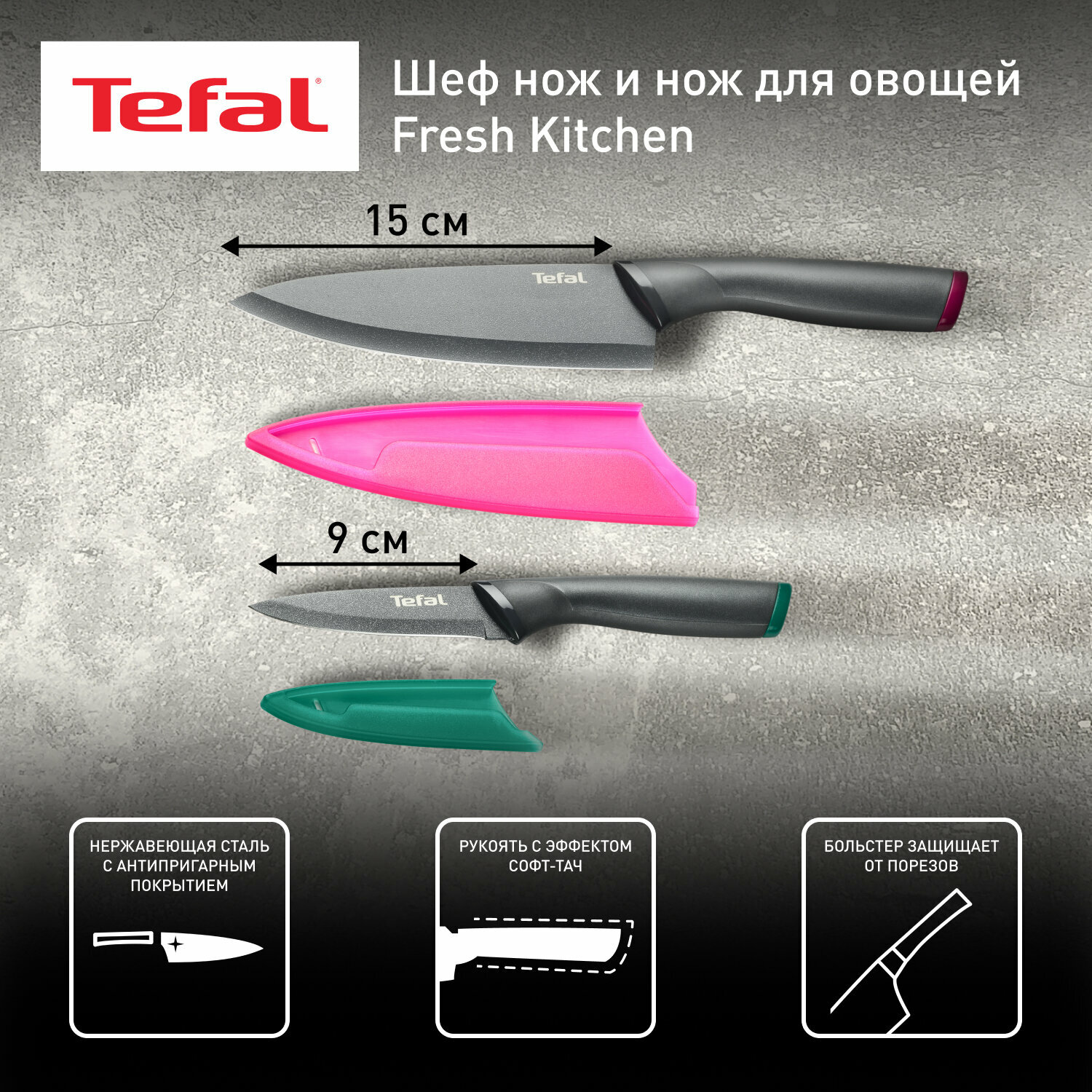 | Комплектация | шеф-нож 15 см с защитным чехлом, нож для овощей 9 см с защитным чехлом |