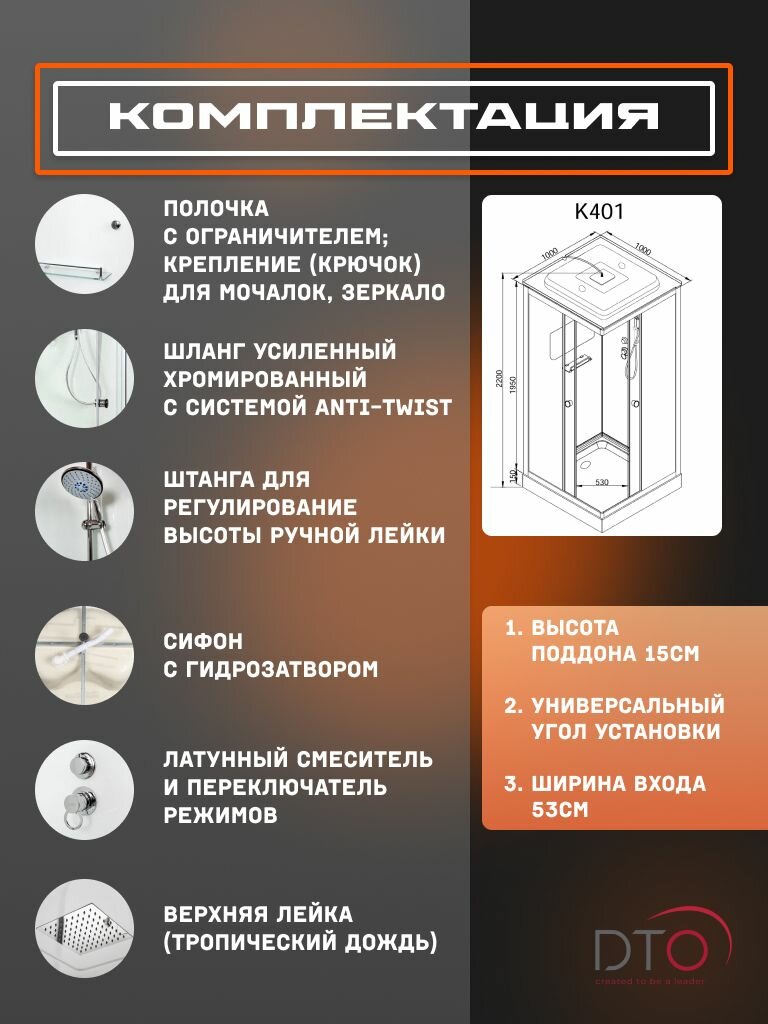 Душевая кабина DTO (Deto) K401S (100х100х220) низкий поддон, стекло прозрачное, универсальная информация: