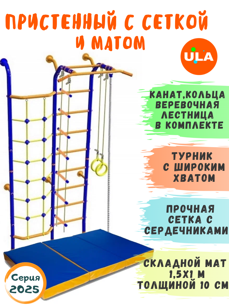 10 цен на Шведская стенка Веселый непоседа Пристенный с сеткой и матом 1.5х1, цвет синий, ступени противоскользящие