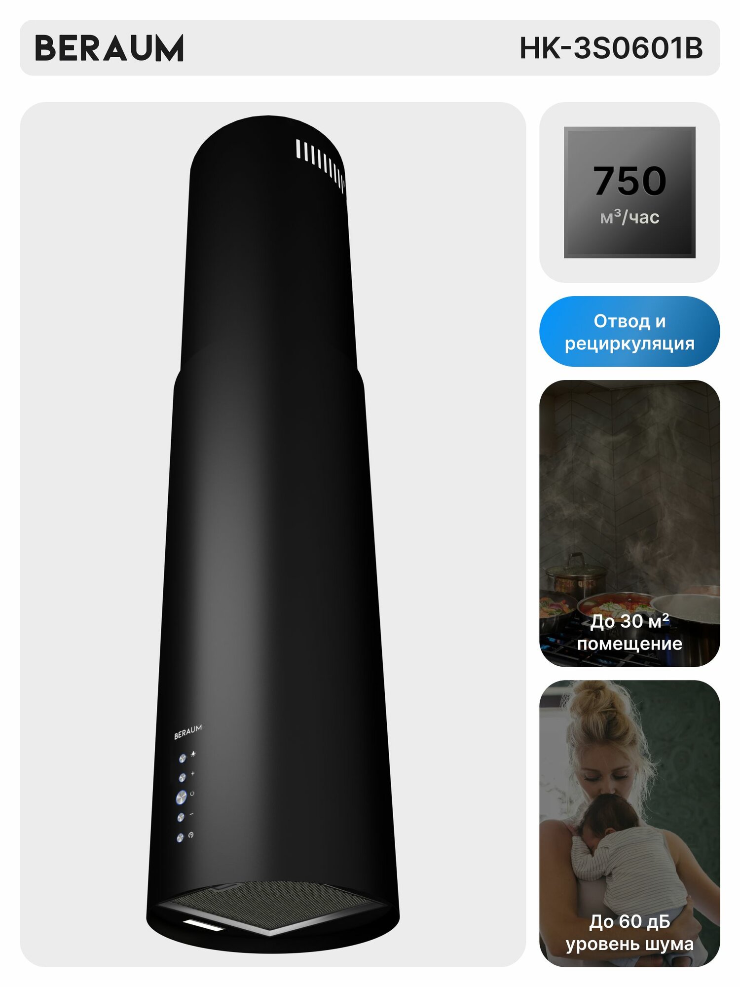 Вытяжка пристенная цилиндрическая Beraum HK-3S005B, чёрный, отвод и циркуляция 27 635 ₽