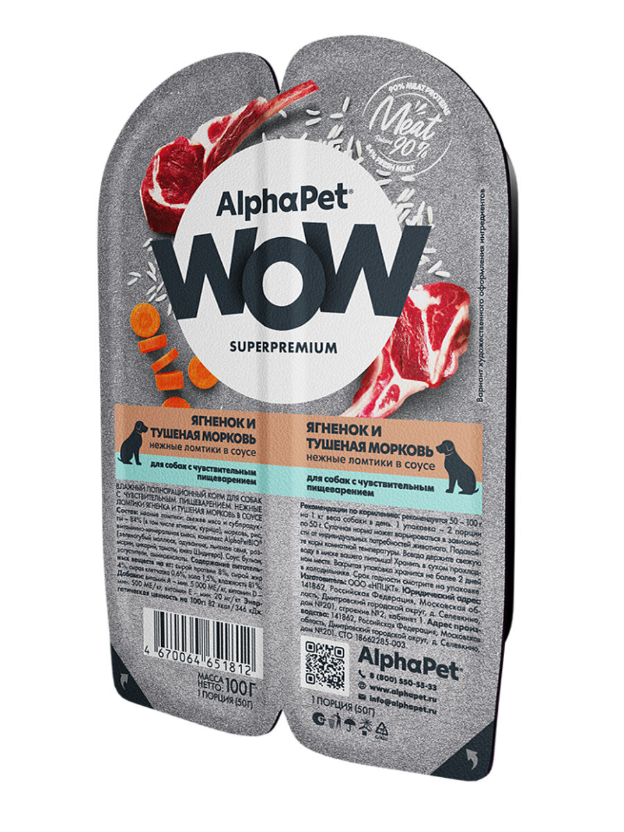 AlphaPet WOW Superpremium влажный корм для собак с чувствительным пищеварением ягненок и тушеная морковь, в ламистерах - 100 г х 15 шт информация: