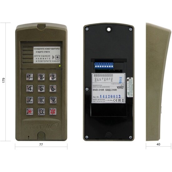 | Дополнительная информация | дуплексная громкоговорящая связь с абонентом, высокая климатическая устойчивость, возможность выключения вызова отдельных квартир; подсветка наборной клавиатуры и зоны считывателя RFID |