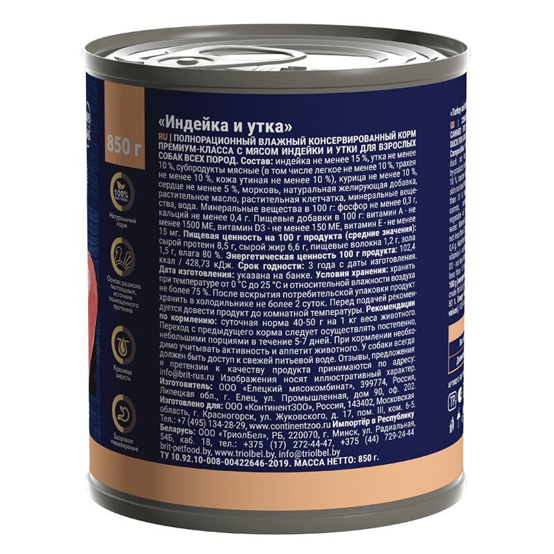 BRIT Premium by Nature Dog Adult Корм влаж.индейка с уткой д/собак конс.850г