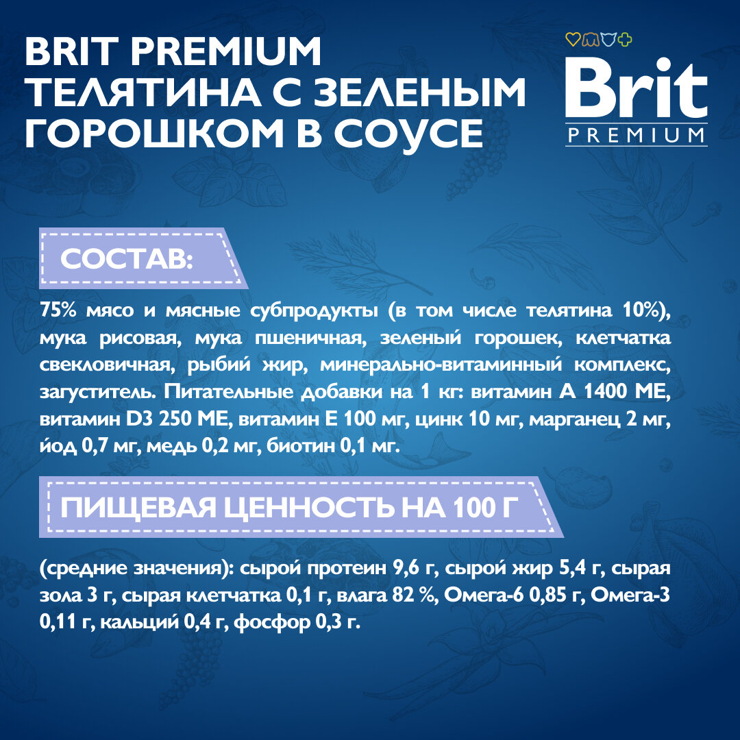 Влажный корм для собак для взрослых собак мини пород, Телятина с зеленым горошком, в соусе, 85г, 14 шт BRIT PREMIUM информация: