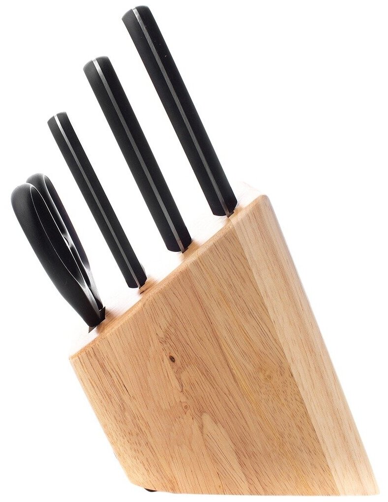 | Комплектация | -нож для чистки овощей 10 см; -нож поварской 15 см; -нож поварской 17 см; -ножницы разъемные 19 см; -подставка для ножей. |