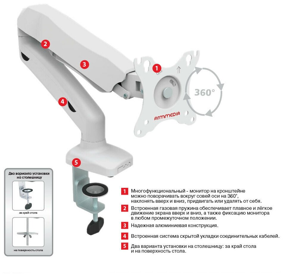10 цен на Кронштейн для мониторов Arm Media LCD-T21w белый 15"-32" макс.6.5кг настольный поворот и наклон верт. перемещ.