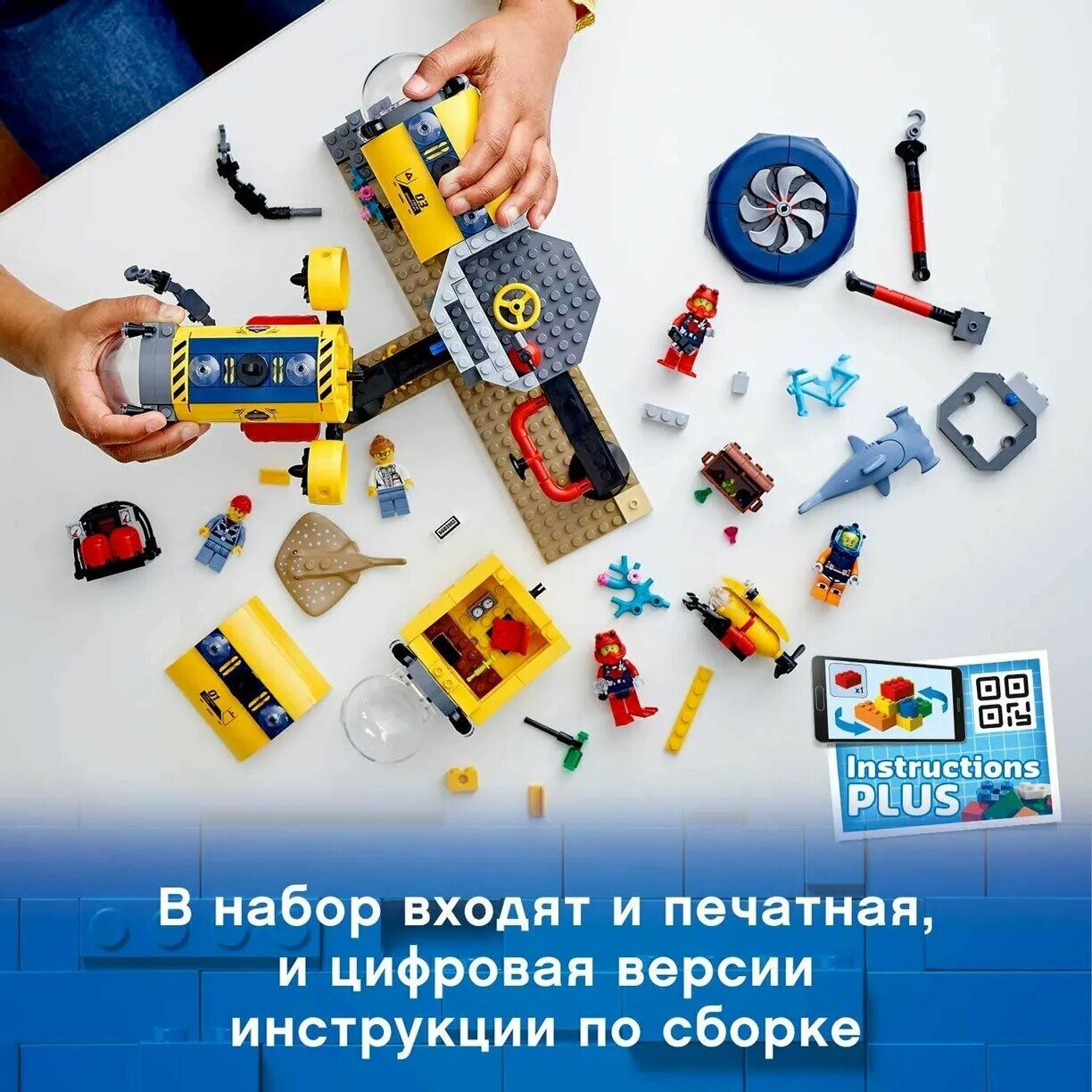 | Комплектация | 497 элементов для сборки; 7 минифигурок: 5 фигурок исследователей, а также скат и акула; пошаговая инструкция по сборке (как в бумажном, так и цифровом формате) |