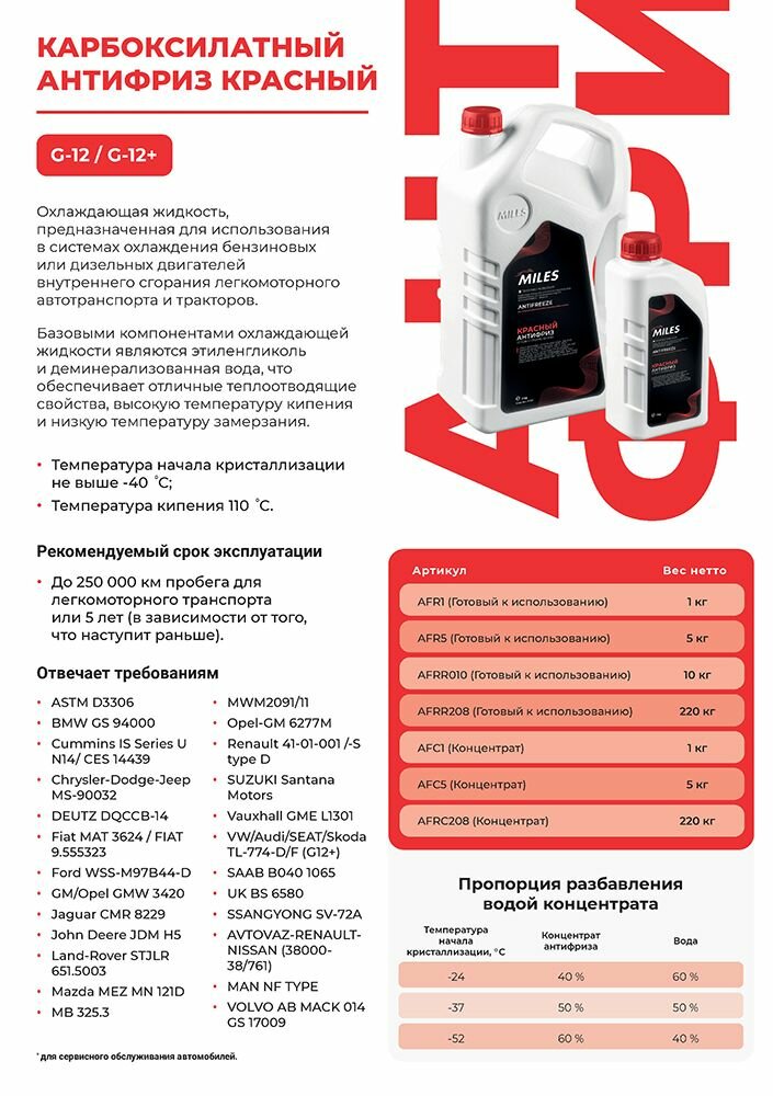 Антифриз MILES красный G12/G12+ готовый 1 кг