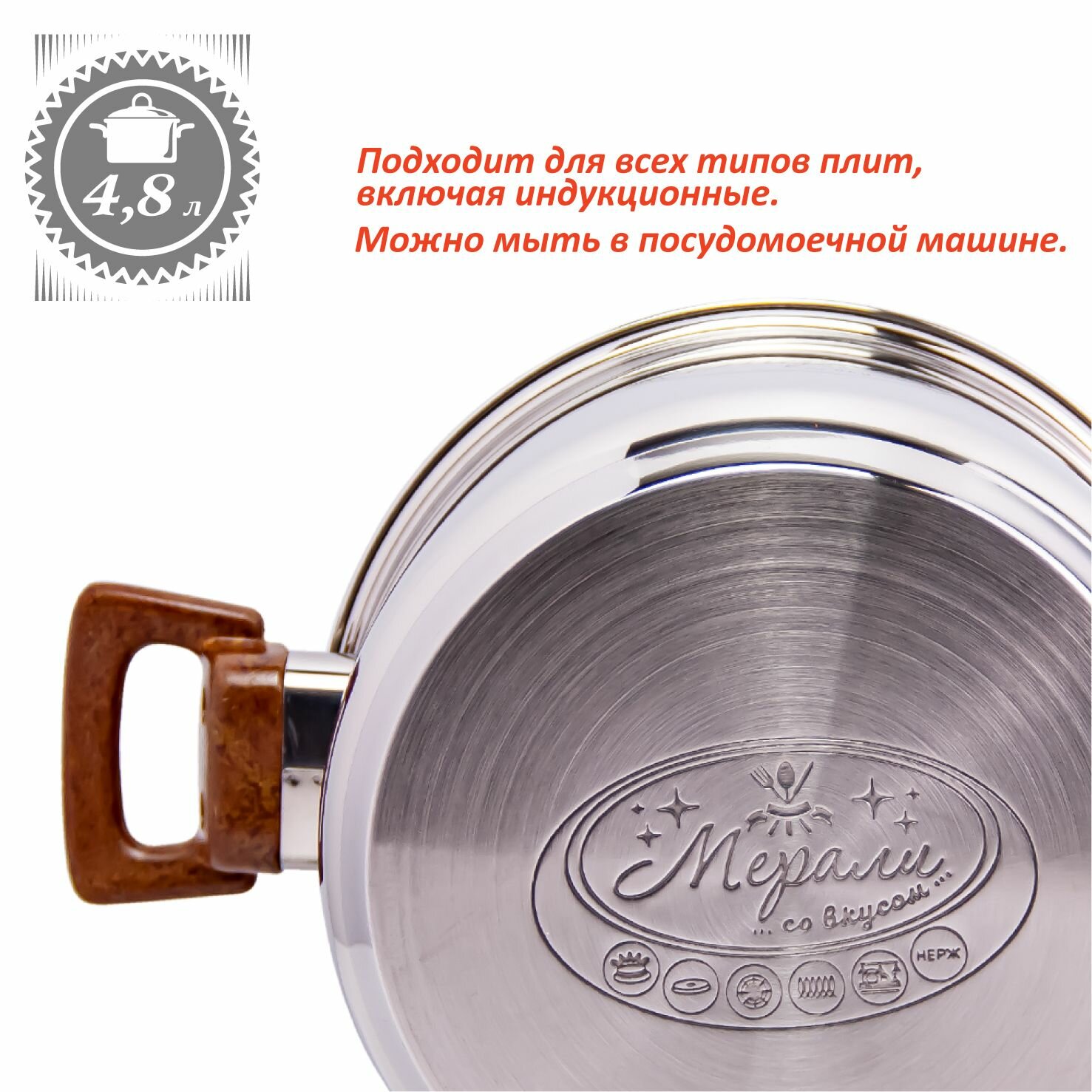Кастрюля с крышкой с ненагревающимися ручками Мерали из нержавеющей стали для газовых электрических и индукционных плит 4,8 л информация: